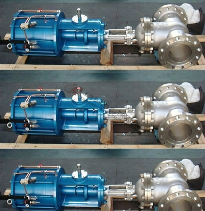 4、氣缸蓋上部裝有氣動-手動轉換裝置。將轉換手柄順時針方向提轉到“氣動”定位孔定位,閘閥處于氣動操作狀態;反之,將轉換手柄逆時針方向提轉到“手動”定于孔處定位,閘閥即可進行手動操作。帶錐齒輪的手柄轉換方向相反。 手動操作閘閥時,手輪旋向和普通手動閥一樣,即順時針轉為關,逆時針轉為開。帶錐齒輪轉動的相反。