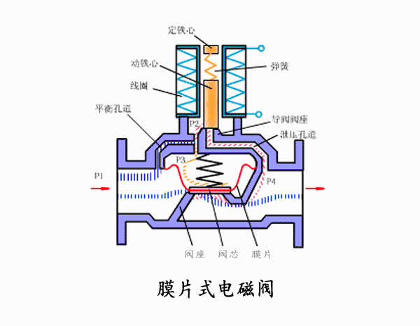 當電磁閥電磁線圈通電時,線圈激磁回路形成磁場并產生磁力,活動鐵芯受電磁力的吸引克服了自重與彈簧的阻力而上升。當工作壓力小于0.05Mpa時,活動鐵芯上移打開導閥直接拉動主閥口膜片,形成通路;當工作壓力大于0.05Mpa時,通過首先打開導閥,使膜片上下腔產生壓力差,膜片在差動力的作用下克服自重和閥芯彈簧而開啟隨即主閥口全開,斷開電源時,導閥口在彈簧力的作用下關閉,閥芯膜片受向下的壓力而關閉主閥口,閥口斷流,電磁閥處于關閉狀態(常開閥與此相反)。